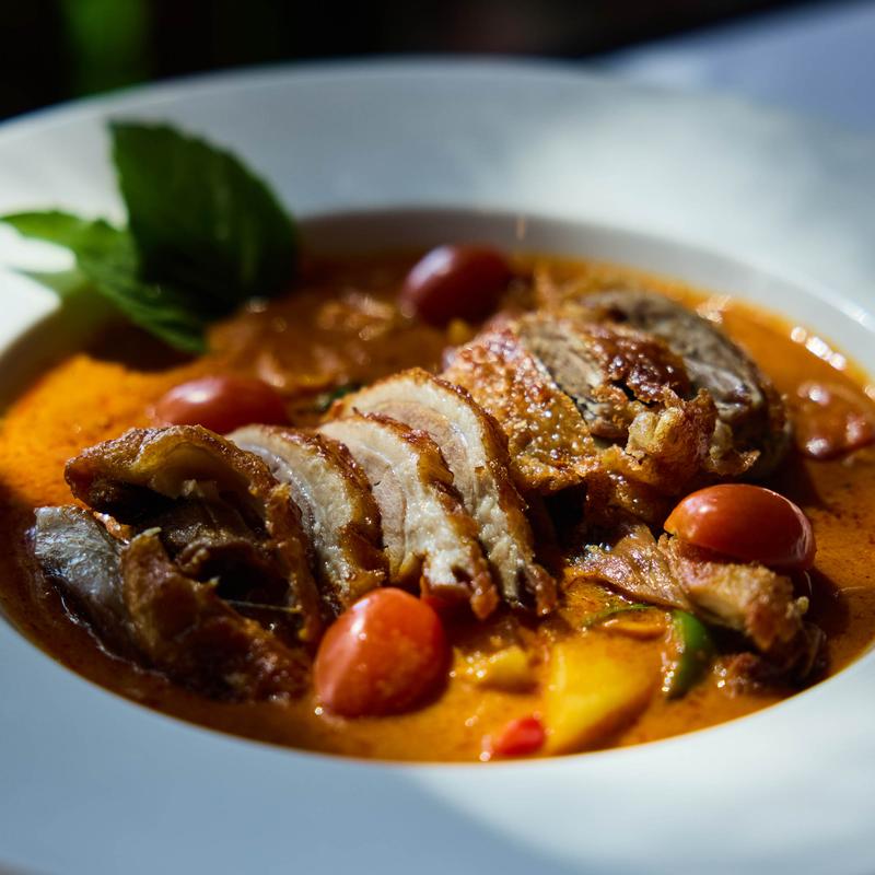 A chef blended red curry with crispy roasted duck, coconut milk, lychee,longan, pineapple, bell pepper, basil, and tomatoes. Served with your choice of Jasmine rice or roti pancake. (Kalabaw most popular curry)