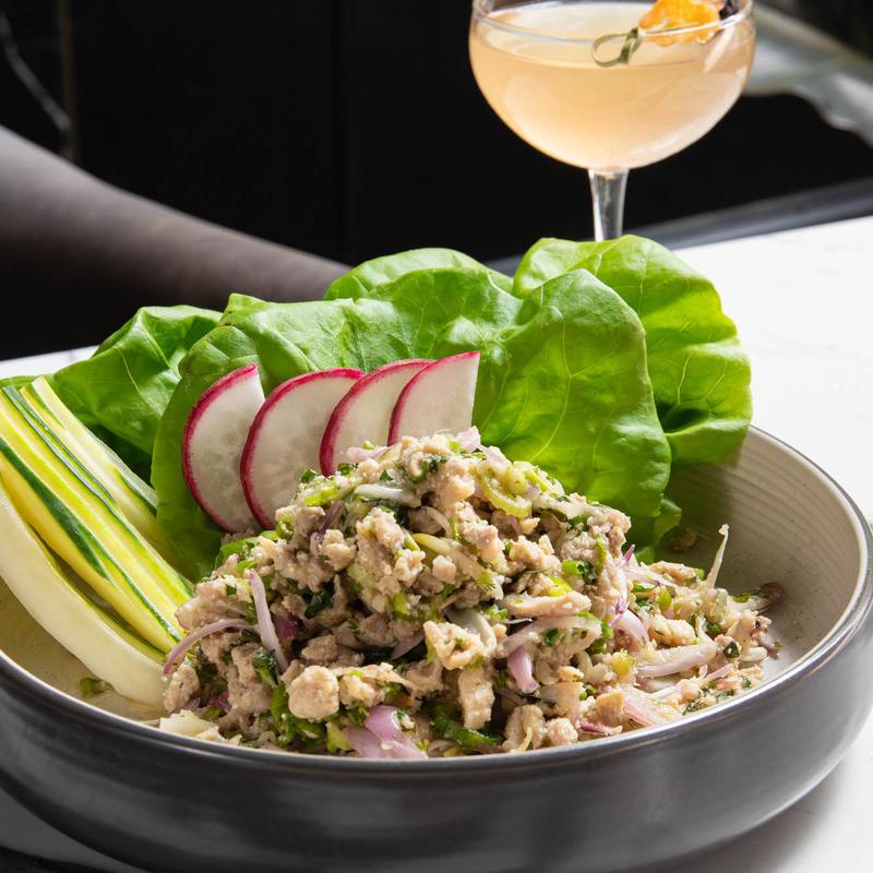 Ground chicken thighs, garlic, shiitake mushrooms, and onions sautéed in a flavorful Kalabaw sauce, encased in crisp Bibb lettuce. The dish is finished off with a zesty pineapple herbal sauce and crispy fried garlic on top.
