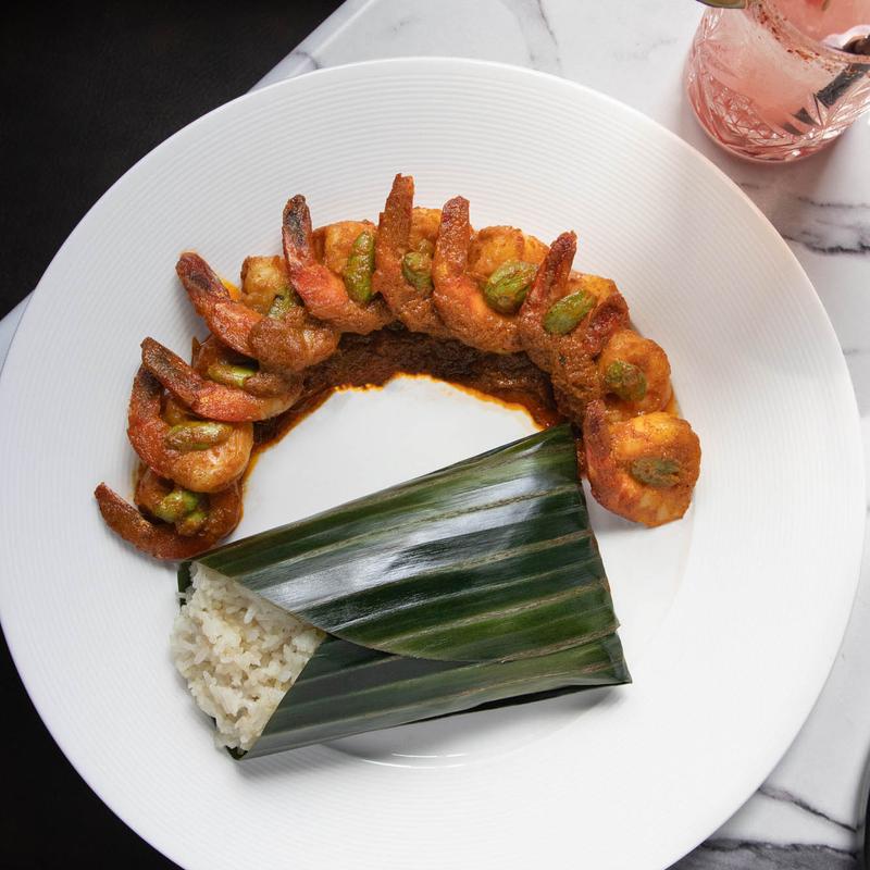 (Udang Sambal Serai Bersantan). Delicate shrimp embraced by velvety coconut milk and a tango of chil, entwined with the essence of a fragrant dry curry. Served atop a cloud of Jasmine rice infused with the aroma of coconut.