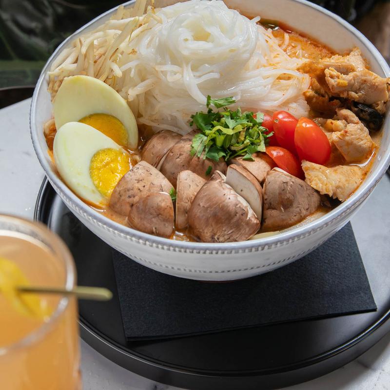 A cozy bowl filled with the creamy richness of coconut creare and evaporated milk spiced up with a symphony of Thai flavors. Tomatoes, onion, lemongrass, galangal, lime leaf, culantro, cilantro, hard-boiled egg, bean sprouts, and cremini mushrooms dance around rice-noodles, offering a soul-soothing experience | Choose your protein: Chicken, Tofu, or Shrimp +$8.00, Seafood +$8 Wild Japanese Sea Bass +$10.00, Lobster (4oz) +$22.00,