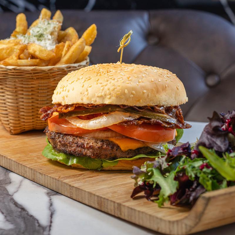 Handcrafted Angus chuck beef patty, bacon, housemade cucumber pickled, tomatoe, bib lettuce Kalabaw burger sauce. Srved with Ginger truffle firs, salad