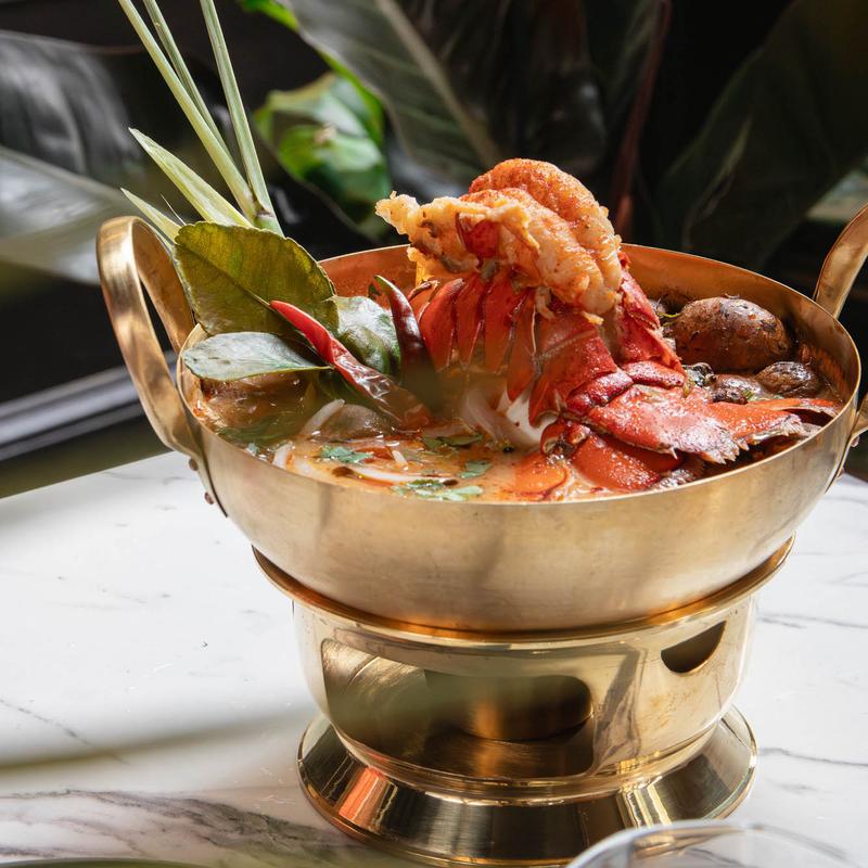 Thai Herbal Hot and Sour Soup: A flavorful blend of lemongrass, kaffir lime leaves, onions, and coriander roots, seasoned with tamarind juice, lime juice, bird’s eye chilis, basil, mushrooms, and toasted dried chilis. served with your choice of>>>> | Chicken, Tofu, // Shrimp +$6.00, Japanese Sea Bass +$13.00, Lobster tail (4oz) +$22.00, Tiger prawns $12.00, Seafood $8.00, and Blue crab $12.00